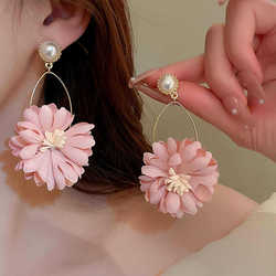 Gran dulce tela Rosa flor imitación perla plata aguja gota pendientes coreano verano primavera flor pétalo moda para mujer