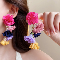 Moda taze renk kumaş büyük gül çiçek küpe tatlı parti tatil pembe kırmızı renk çiçek püsküller küpe kadın takı